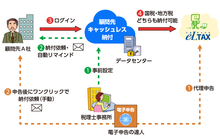 納付業務を「税理士が管理し、顧問先が実行する」ためのサービスです。