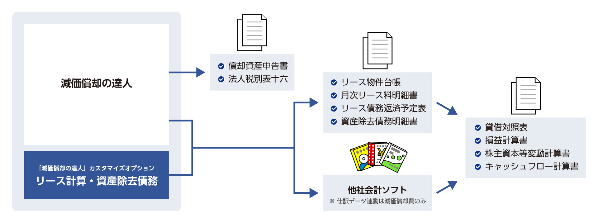 | 減価償却の達人 | 減価償却計算 償却資産申告書の作成 法人税別表十六関連の出力 他会計ソフトとの仕訳データ連携(順次拡充予定) |