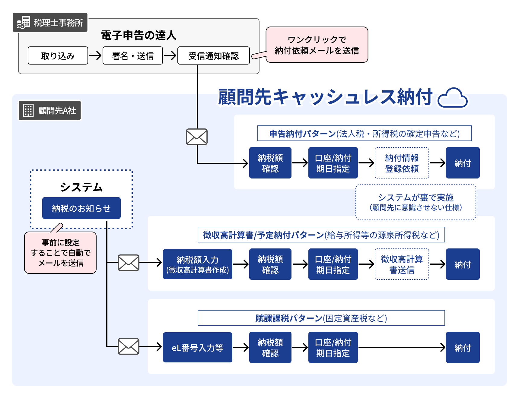 税理士から顧問先に、キャッシュレス納付の環境を提供することで、両者の納付業務をキャッシュレス化・効率化するツールです。