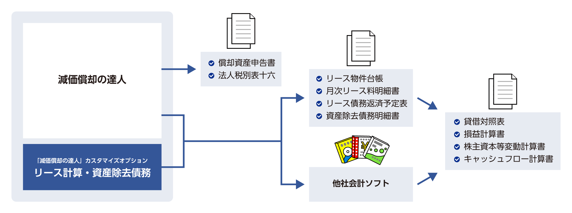 リース資産の登録や資産除去債務などの入力や管理、台帳やデータの出力が可能となり、財務諸表を作成するために必要な固定資産管理業務を支援いたします。