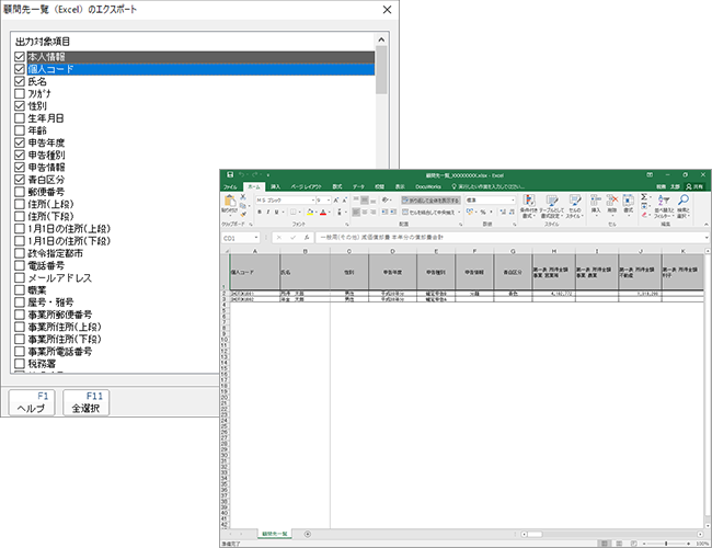 作成した申告データ内にある税額の情報など、お客様が確認したい項目を選択して、複数の申告データの情報を横断的に一括でExcel形式のファイルに出力ができます。出力した情報は、申告データの内容のチェックや分析などさまざまな用途でご活用いただけます。