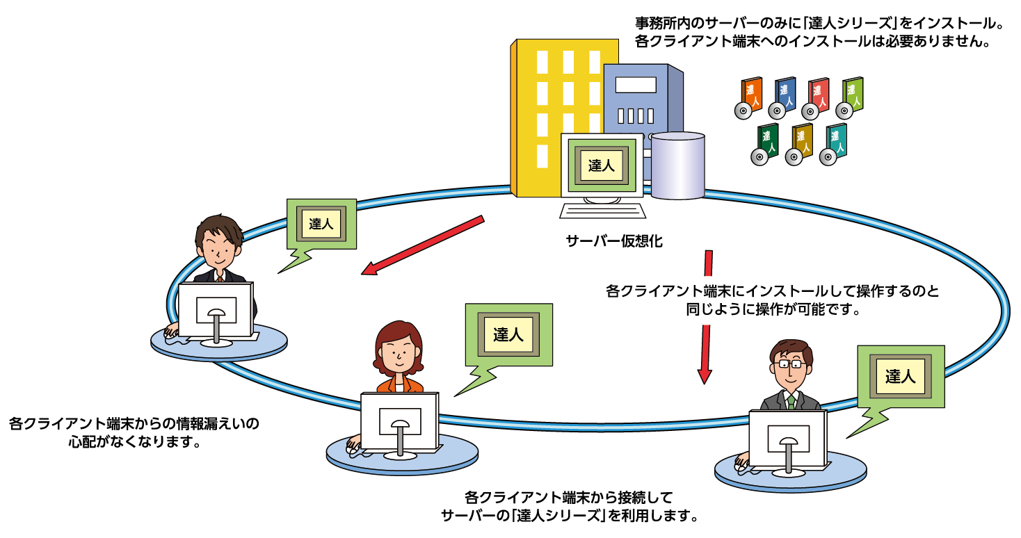 仮想化環境は、ITインフラ環境にかかるコストの削減やシステム部門の負担軽減、セキュリティの向上などさまざまなメリットがあることから、昨今、企業や大規模税理士事務所で導入が進んでいます。こういった時代のニーズに合わせ、アプリケーションの仮想化やデスクトップの仮想化といった仮想化環境上で、「達人シリーズ」をご利用いただくために必要なサービスが「仮想化対策」です。